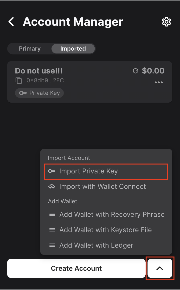 To add the private key to your core wallet, open the core extension and navigate to the Account Manager. Then click the arrow button and select Import Private Key.