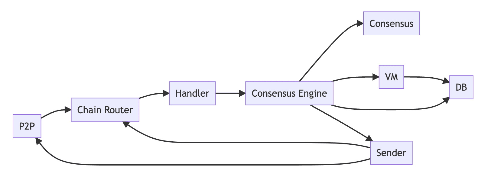 The ChainRouter routes all incoming messages to its respective blockchain using ChainID. It does this by pushing all the messages onto the respective Chain handler's queue. The ChainRouter references all existing chains on the network such as the X-chain, C-chain, P-chain and possibly any other chain. The ChainRouter handles timeouts as well. When sending messages on the P2P layer, timeouts are registered on the sender and cleared on the ChainRouter side when a response is received. If no response is received, then it triggers a timeout. Because timeouts are handled on the ChainRouter side, the handler is reliable. Timeouts are triggered when peers do not respond and the ChainRouter will still notify the handler of failure cases. The timeout manager within ChainRouter is also adaptive. If the network is experiencing long latencies, timeouts will then be adjusted as well.